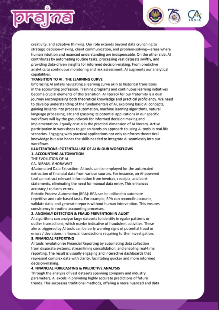A symbiotic relationship between Human Intelligence and AI which reflects not competition but rather a fusion of strengths will present a paradigm shift in our approach. A collaborative approach where human expertise merge with the capabilities of AI (tools) will redefine the landscape of our profession. We, Chartered Accountants, bring to the table deep industry knowledge, ethical judgment, creativity, and adaptive thinking. Our role extends beyond data crunching to strategic decision-making, client communication, and problem-solving—areas where human intuition and nuanced understanding are indispensable. On the other side, AI contributes by automating routine tasks, processing vast datasets swiftly, and providing data-driven insights for informed decision-making. From predictive analytics to continuous monitoring and risk assessment, AI augments our analytical capabilities.