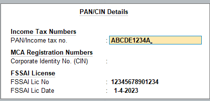 - Gateway of Tally –> Alter –> PAN/CIN Details