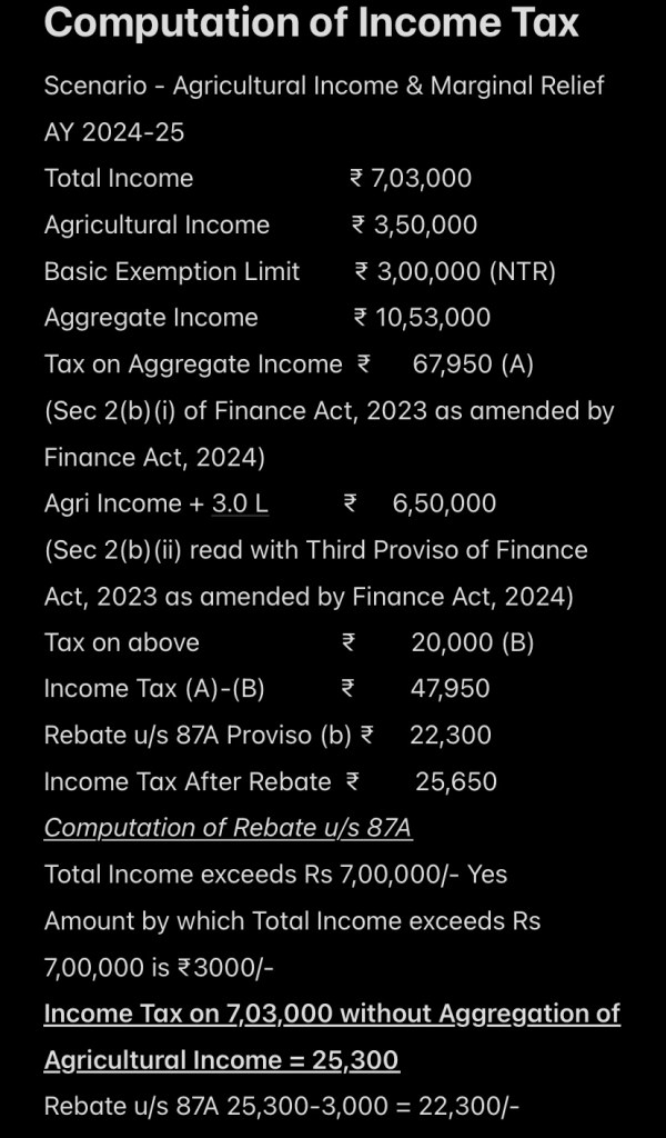 Computation of Income Tax in a Scenario where Marginal Relief & Agricultural Income for AY 2024-25